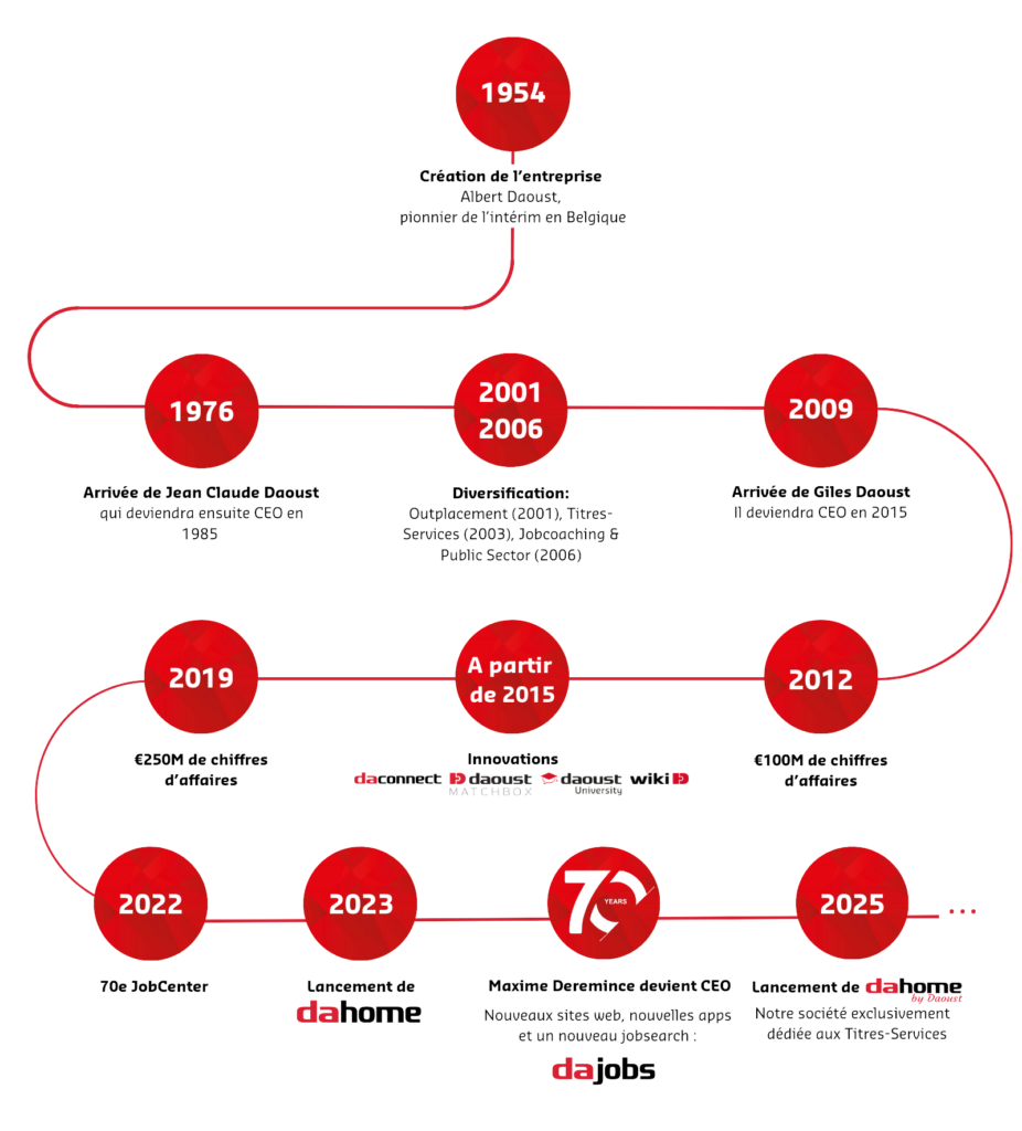 Dajobs est une entreprise belge RH à taille humaine et familiale de 3ème génération depuis plus de 70 ans. Une course de relais qui s’est faite de père en fils, tous caractérisés par leurs valeurs, leur vision d’avenir et leur volonté d’inscrire l’entreprise dans la continuité.