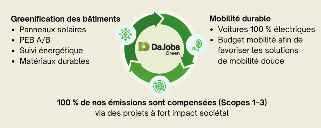 Conscients de l’empreinte carbone qu’une entreprise de plus de 70 JobCenters peut avoir, nous prenons des mesures afin de la réduire. Rien qu’au siège, nous avons déjà investi dans des thermostats intelligents, des panneaux solaires ainsi que l’énergie verte pour tous nos locaux.